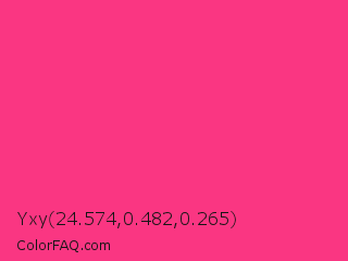Yxy 24.574,0.482,0.265 Color is a normal rose color and the nearest color is Cerise Pink #ec3b83. Hex code #fa3682 and RGB value is rgb(250,54,130). In RGB color space, this color is composed of 98% red, 21% green, 51% blue, In CMYK color space, this color is composed of 0% cyan, 78% magenta, 48% yellow , 2% black , In HSL color space, this color has a hue angle of 337° , 95% saturation and 60% lightness.