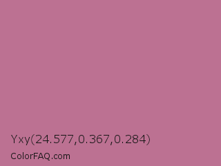 Yxy 24.577,0.367,0.284 Color is a normal rose color and the nearest color is Turkish Rose #b57281. Hex code #bc7192 and RGB value is rgb(188,113,146). In RGB color space, this color is composed of 74% red, 44% green, 57% blue, In CMYK color space, this color is composed of 0% cyan, 40% magenta, 22% yellow , 26% black , In HSL color space, this color has a hue angle of 334° , 36% saturation and 59% lightness.