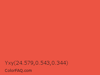 Yxy 24.579,0.543,0.344 Color is a normal red color and the nearest color is Carmine Pink #eb4c42. Hex code #ec5443 and RGB value is rgb(236,84,67). In RGB color space, this color is composed of 93% red, 33% green, 26% blue, In CMYK color space, this color is composed of 0% cyan, 64% magenta, 72% yellow , 7% black , In HSL color space, this color has a hue angle of 6° , 82% saturation and 59% lightness.
