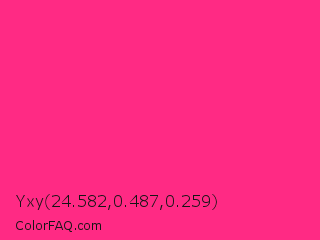 Yxy 24.582,0.487,0.259 Color is a normal rose color and the nearest color is Wild Strawberry Crayola #ff3399. Hex code #ff2a84 and RGB value is rgb(255,42,132). In RGB color space, this color is composed of 100% red, 16% green, 52% blue, In CMYK color space, this color is composed of 0% cyan, 84% magenta, 48% yellow , 0% black , In HSL color space, this color has a hue angle of 335° , 100% saturation and 58% lightness.