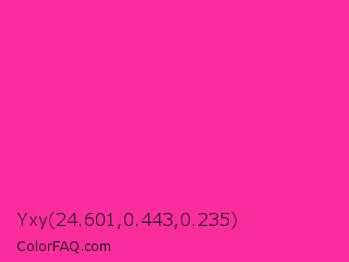 Yxy 24.601,0.443,0.235 Color is a normal rose color and the nearest color is Wild Strawberry Crayola #ff3399. Hex code #fa2d9c and RGB value is rgb(250,45,156). In RGB color space, this color is composed of 98% red, 18% green, 61% blue, In CMYK color space, this color is composed of 0% cyan, 82% magenta, 38% yellow , 2% black , In HSL color space, this color has a hue angle of 328° , 95% saturation and 58% lightness.
