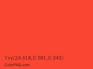 Yxy 24.618,0.581,0.343 Color is a normal red color and the nearest color is Red Orange #ff3f34. Hex code #f94531 and RGB value is rgb(249,69,49). In RGB color space, this color is composed of 98% red, 27% green, 19% blue, In CMYK color space, this color is composed of 0% cyan, 72% magenta, 80% yellow , 2% black , In HSL color space, this color has a hue angle of 6° , 94% saturation and 58% lightness.