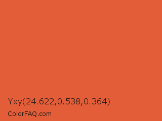 Yxy 24.622,0.538,0.364 Color is a normal red color and the nearest color is Flame Pea #da5b38. Hex code #e35e38 and RGB value is rgb(227,94,56). In RGB color space, this color is composed of 89% red, 37% green, 22% blue, In CMYK color space, this color is composed of 0% cyan, 59% magenta, 75% yellow , 11% black , In HSL color space, this color has a hue angle of 13° , 75% saturation and 55% lightness.