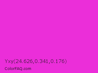 Yxy 24.626,0.341,0.176 Color is a normal magenta color and the nearest color is Razzle Dazzle Rose #ff33cc. Hex code #eb2ed9 and RGB value is rgb(235,46,217). In RGB color space, this color is composed of 92% red, 18% green, 85% blue, In CMYK color space, this color is composed of 0% cyan, 80% magenta, 8% yellow , 8% black , In HSL color space, this color has a hue angle of 306° , 83% saturation and 55% lightness.