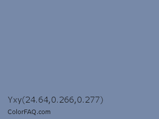 Yxy 24.64,0.266,0.277 Color is a normal blue color and the nearest color is Shadow Blue #778ba5. Hex code #7789a8 and RGB value is rgb(119,137,168). In RGB color space, this color is composed of 47% red, 54% green, 66% blue, In CMYK color space, this color is composed of 29% cyan, 18% magenta, 0% yellow , 34% black , In HSL color space, this color has a hue angle of 218° , 22% saturation and 56% lightness.
