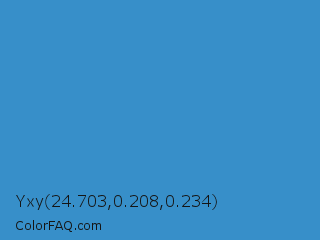 Yxy 24.703,0.208,0.234 Color is a normal blue color and the nearest color is Curious Blue #2596d1. Hex code #378fc9 and RGB value is rgb(55,143,201). In RGB color space, this color is composed of 22% red, 56% green, 79% blue, In CMYK color space, this color is composed of 73% cyan, 29% magenta, 0% yellow , 21% black , In HSL color space, this color has a hue angle of 204° , 57% saturation and 50% lightness.