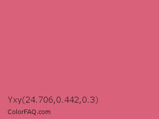 Yxy 24.706,0.442,0.3 Color is a light red color and the nearest color is Blush #de5d83. Hex code #d9617a and RGB value is rgb(217,97,122). In RGB color space, this color is composed of 85% red, 38% green, 48% blue, In CMYK color space, this color is composed of 0% cyan, 55% magenta, 44% yellow , 15% black , In HSL color space, this color has a hue angle of 348° , 61% saturation and 62% lightness.