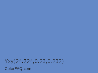 Yxy 24.724,0.23,0.232 Color is a normal blue color and the nearest color is Danube #6093d1. Hex code #6489c7 and RGB value is rgb(100,137,199). In RGB color space, this color is composed of 39% red, 54% green, 78% blue, In CMYK color space, this color is composed of 50% cyan, 31% magenta, 0% yellow , 22% black , In HSL color space, this color has a hue angle of 218° , 47% saturation and 59% lightness.