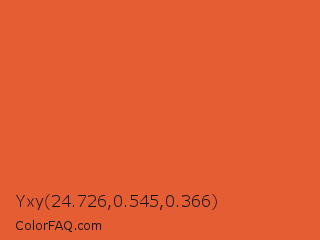 Yxy 24.726,0.545,0.366 Color is a normal red color and the nearest color is Flame Pea #da5b38. Hex code #e55d33 and RGB value is rgb(229,93,51). In RGB color space, this color is composed of 90% red, 36% green, 20% blue, In CMYK color space, this color is composed of 0% cyan, 59% magenta, 78% yellow , 10% black , In HSL color space, this color has a hue angle of 14° , 77% saturation and 55% lightness.