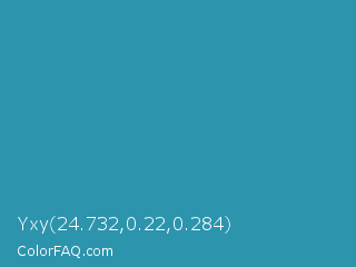 Yxy 24.732,0.22,0.284 Color is a normal cyan color and the nearest color is Eastern Blue #1e9ab0. Hex code #2c94ad and RGB value is rgb(44,148,173). In RGB color space, this color is composed of 17% red, 58% green, 68% blue, In CMYK color space, this color is composed of 75% cyan, 14% magenta, 0% yellow , 32% black , In HSL color space, this color has a hue angle of 192° , 59% saturation and 43% lightness.