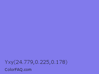Yxy 24.779,0.225,0.178 Color is a light indigo color and the nearest color is Medium Slate Blue #7b68ee. Hex code #817aed and RGB value is rgb(129,122,237). In RGB color space, this color is composed of 51% red, 48% green, 93% blue, In CMYK color space, this color is composed of 46% cyan, 49% magenta, 0% yellow , 7% black , In HSL color space, this color has a hue angle of 244° , 76% saturation and 70% lightness.