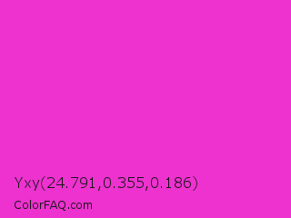 Yxy 24.791,0.355,0.186 Color is a normal magenta color and the nearest color is Razzle Dazzle Rose #ff33cc. Hex code #ed32cf and RGB value is rgb(237,50,207). In RGB color space, this color is composed of 93% red, 20% green, 81% blue, In CMYK color space, this color is composed of 0% cyan, 79% magenta, 13% yellow , 7% black , In HSL color space, this color has a hue angle of 310° , 84% saturation and 56% lightness.