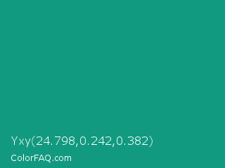 Yxy 24.798,0.242,0.382 Color is a normal cyan color and the nearest color is Gossamer #069b81. Hex code #129a80 and RGB value is rgb(18,154,128). In RGB color space, this color is composed of 7% red, 60% green, 50% blue, In CMYK color space, this color is composed of 88% cyan, 0% magenta, 17% yellow , 40% black , In HSL color space, this color has a hue angle of 169° , 79% saturation and 34% lightness.