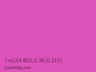Yxy 24.802,0.36,0.215 Color is a normal magenta color and the nearest color is Fuchsia Pink #c154c1. Hex code #dd51ba and RGB value is rgb(221,81,186). In RGB color space, this color is composed of 87% red, 32% green, 73% blue, In CMYK color space, this color is composed of 0% cyan, 63% magenta, 16% yellow , 13% black , In HSL color space, this color has a hue angle of 315° , 67% saturation and 59% lightness.