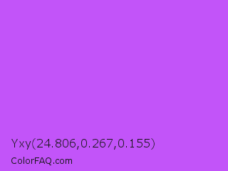 Yxy 24.806,0.267,0.155 Color is a light purple color and the nearest color is Medium Orchid #ba55d3. Hex code #c254f9 and RGB value is rgb(194,84,249). In RGB color space, this color is composed of 76% red, 33% green, 98% blue, In CMYK color space, this color is composed of 22% cyan, 66% magenta, 0% yellow , 2% black , In HSL color space, this color has a hue angle of 280° , 93% saturation and 65% lightness.