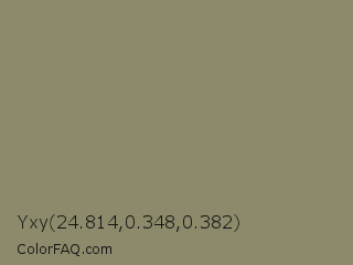 Yxy 24.814,0.348,0.382 Color is a normal yellow color and the nearest color is Avocado Pulp #888d65. Hex code #8c8a6b and RGB value is rgb(140,138,107). In RGB color space, this color is composed of 55% red, 54% green, 42% blue, In CMYK color space, this color is composed of 0% cyan, 1% magenta, 24% yellow , 45% black , In HSL color space, this color has a hue angle of 56° , 13% saturation and 48% lightness.