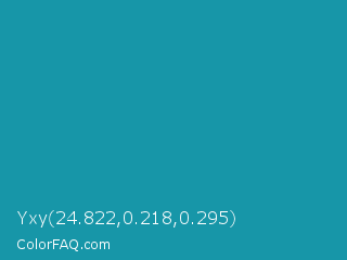 Yxy 24.822,0.218,0.295 Color is a normal cyan color and the nearest color is Eastern Blue #1e9ab0. Hex code #1796a8 and RGB value is rgb(23,150,168). In RGB color space, this color is composed of 9% red, 59% green, 66% blue, In CMYK color space, this color is composed of 86% cyan, 11% magenta, 0% yellow , 34% black , In HSL color space, this color has a hue angle of 187° , 76% saturation and 37% lightness.