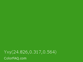 Yxy 24.826,0.317,0.564 Color is a normal green color and the nearest color is Slimy Green #299617. Hex code #3b9c1d and RGB value is rgb(59,156,29). In RGB color space, this color is composed of 23% red, 61% green, 11% blue, In CMYK color space, this color is composed of 62% cyan, 0% magenta, 81% yellow , 39% black , In HSL color space, this color has a hue angle of 106° , 69% saturation and 36% lightness.