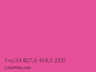Yxy 24.827,0.419,0.253 Color is a light rose color and the nearest color is Raspberry Pink #e25098. Hex code #e65098 and RGB value is rgb(230,80,152). In RGB color space, this color is composed of 90% red, 31% green, 60% blue, In CMYK color space, this color is composed of 0% cyan, 65% magenta, 34% yellow , 10% black , In HSL color space, this color has a hue angle of 331° , 75% saturation and 61% lightness.
