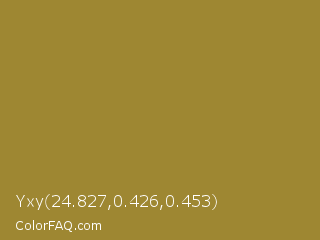Yxy 24.827,0.426,0.453 Color is a normal yellow color and the nearest color is Luxor Gold #a7882c. Hex code #9e8732 and RGB value is rgb(158,135,50). In RGB color space, this color is composed of 62% red, 53% green, 20% blue, In CMYK color space, this color is composed of 0% cyan, 15% magenta, 68% yellow , 38% black , In HSL color space, this color has a hue angle of 47° , 52% saturation and 41% lightness.