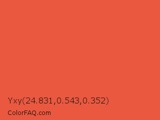 Yxy 24.831,0.543,0.352 Color is a normal red color and the nearest color is Carmine Pink #eb4c42. Hex code #ea583f and RGB value is rgb(234,88,63). In RGB color space, this color is composed of 92% red, 35% green, 25% blue, In CMYK color space, this color is composed of 0% cyan, 62% magenta, 73% yellow , 8% black , In HSL color space, this color has a hue angle of 9° , 80% saturation and 58% lightness.