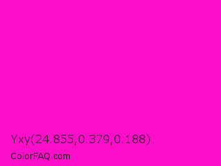 Yxy 24.855,0.379,0.188 Color is a normal magenta color and the nearest color is Shocking Pink #fc0fc0. Hex code #fa0ec9 and RGB value is rgb(250,14,201). In RGB color space, this color is composed of 98% red, 5% green, 79% blue, In CMYK color space, this color is composed of 0% cyan, 94% magenta, 20% yellow , 2% black , In HSL color space, this color has a hue angle of 312° , 96% saturation and 52% lightness.