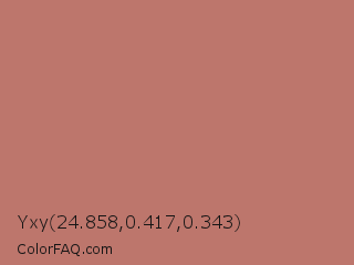 Yxy 24.858,0.417,0.343 Color is a normal red color and the nearest color is Contessa #c6726b. Hex code #bd766c and RGB value is rgb(189,118,108). In RGB color space, this color is composed of 74% red, 46% green, 42% blue, In CMYK color space, this color is composed of 0% cyan, 38% magenta, 43% yellow , 26% black , In HSL color space, this color has a hue angle of 7° , 38% saturation and 58% lightness.