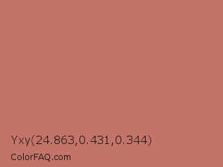 Yxy 24.863,0.431,0.344 Color is a normal red color and the nearest color is Contessa #c6726b. Hex code #c37368 and RGB value is rgb(195,115,104). In RGB color space, this color is composed of 76% red, 45% green, 41% blue, In CMYK color space, this color is composed of 0% cyan, 41% magenta, 47% yellow , 24% black , In HSL color space, this color has a hue angle of 7° , 43% saturation and 59% lightness.