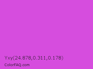 Yxy 24.878,0.311,0.178 Color is a normal magenta color and the nearest color is Medium Orchid #ba55d3. Hex code #d64dde and RGB value is rgb(214,77,222). In RGB color space, this color is composed of 84% red, 30% green, 87% blue, In CMYK color space, this color is composed of 4% cyan, 65% magenta, 0% yellow , 13% black , In HSL color space, this color has a hue angle of 297° , 69% saturation and 59% lightness.