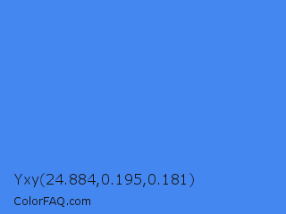 Yxy 24.884,0.195,0.181 Color is a normal blue color and the nearest color is Blueberry #4f86f7. Hex code #4487f0 and RGB value is rgb(68,135,240). In RGB color space, this color is composed of 27% red, 53% green, 94% blue, In CMYK color space, this color is composed of 72% cyan, 44% magenta, 0% yellow , 6% black , In HSL color space, this color has a hue angle of 217° , 85% saturation and 60% lightness.