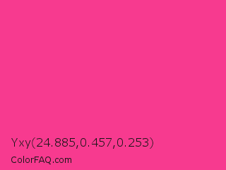 Yxy 24.885,0.457,0.253 Color is a normal rose color and the nearest color is French Fuchsia #fd3f92. Hex code #f73a8f and RGB value is rgb(247,58,143). In RGB color space, this color is composed of 97% red, 23% green, 56% blue, In CMYK color space, this color is composed of 0% cyan, 77% magenta, 42% yellow , 3% black , In HSL color space, this color has a hue angle of 333° , 92% saturation and 60% lightness.