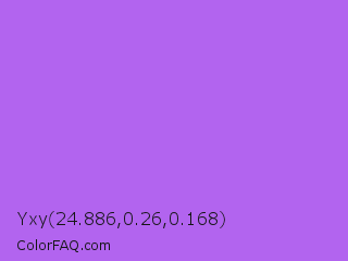 Yxy 24.886,0.26,0.168 Color is a light purple color and the nearest color is Rich Lilac #b666d2. Hex code #b264ef and RGB value is rgb(178,100,239). In RGB color space, this color is composed of 70% red, 39% green, 94% blue, In CMYK color space, this color is composed of 26% cyan, 58% magenta, 0% yellow , 6% black , In HSL color space, this color has a hue angle of 274° , 81% saturation and 66% lightness.