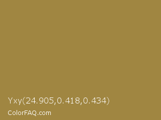 Yxy 24.905,0.418,0.434 Color is a normal orange color and the nearest color is Metallic Sunburst #9c7c38. Hex code #a08641 and RGB value is rgb(160,134,65). In RGB color space, this color is composed of 63% red, 53% green, 25% blue, In CMYK color space, this color is composed of 0% cyan, 16% magenta, 59% yellow , 37% black , In HSL color space, this color has a hue angle of 44° , 42% saturation and 44% lightness.