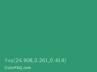 Yxy 24.908,0.261,0.414 Color is a normal green color and the nearest color is Illuminating Emerald #319177. Hex code #2f9a71 and RGB value is rgb(47,154,113). In RGB color space, this color is composed of 18% red, 60% green, 44% blue, In CMYK color space, this color is composed of 69% cyan, 0% magenta, 27% yellow , 40% black , In HSL color space, this color has a hue angle of 157° , 53% saturation and 39% lightness.