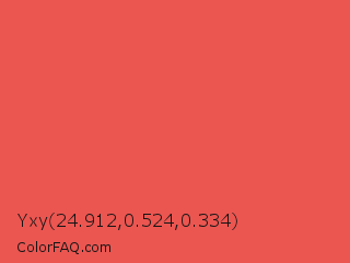 Yxy 24.912,0.524,0.334 Color is a light red color and the nearest color is Carmine Pink #eb4c42. Hex code #eb5651 and RGB value is rgb(235,86,81). In RGB color space, this color is composed of 92% red, 34% green, 32% blue, In CMYK color space, this color is composed of 0% cyan, 63% magenta, 66% yellow , 8% black , In HSL color space, this color has a hue angle of 2° , 79% saturation and 62% lightness.