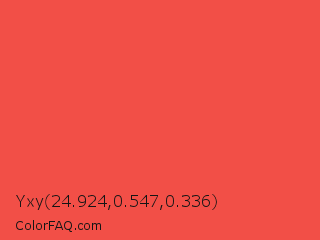 Yxy 24.924,0.547,0.336 Color is a light red color and the nearest color is Carmine Pink #eb4c42. Hex code #f24f47 and RGB value is rgb(242,79,71). In RGB color space, this color is composed of 95% red, 31% green, 28% blue, In CMYK color space, this color is composed of 0% cyan, 67% magenta, 71% yellow , 5% black , In HSL color space, this color has a hue angle of 3° , 87% saturation and 61% lightness.