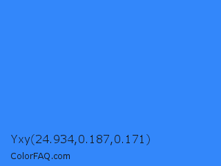 Yxy 24.934,0.187,0.171 Color is a normal blue color and the nearest color is Brilliant Azure #3399ff. Hex code #3387fa and RGB value is rgb(51,135,250). In RGB color space, this color is composed of 20% red, 53% green, 98% blue, In CMYK color space, this color is composed of 80% cyan, 46% magenta, 0% yellow , 2% black , In HSL color space, this color has a hue angle of 215° , 95% saturation and 59% lightness.