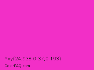 Yxy 24.938,0.37,0.193 Color is a normal magenta color and the nearest color is Razzle Dazzle Rose #ff33cc. Hex code #f22fc7 and RGB value is rgb(242,47,199). In RGB color space, this color is composed of 95% red, 18% green, 78% blue, In CMYK color space, this color is composed of 0% cyan, 81% magenta, 18% yellow , 5% black , In HSL color space, this color has a hue angle of 313° , 88% saturation and 57% lightness.