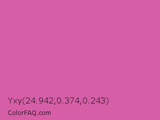 Yxy 24.942,0.374,0.243 Color is a normal magenta color and the nearest color is Super Pink #cf6ba9. Hex code #d55ea7 and RGB value is rgb(213,94,167). In RGB color space, this color is composed of 84% red, 37% green, 65% blue, In CMYK color space, this color is composed of 0% cyan, 56% magenta, 22% yellow , 16% black , In HSL color space, this color has a hue angle of 323° , 59% saturation and 60% lightness.