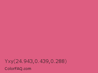Yxy 24.943,0.439,0.288 Color is a light rose color and the nearest color is Blush #de5d83. Hex code #de5d81 and RGB value is rgb(222,93,129). In RGB color space, this color is composed of 87% red, 36% green, 51% blue, In CMYK color space, this color is composed of 0% cyan, 58% magenta, 42% yellow , 13% black , In HSL color space, this color has a hue angle of 343° , 66% saturation and 62% lightness.