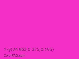 Yxy 24.963,0.375,0.195 Color is a normal magenta color and the nearest color is Razzle Dazzle Rose #ff33cc. Hex code #f32dc5 and RGB value is rgb(243,45,197). In RGB color space, this color is composed of 95% red, 18% green, 77% blue, In CMYK color space, this color is composed of 0% cyan, 81% magenta, 19% yellow , 5% black , In HSL color space, this color has a hue angle of 314° , 89% saturation and 56% lightness.