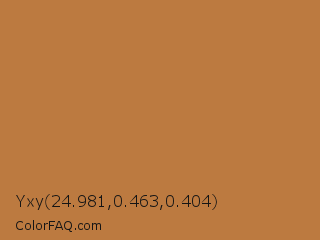 Yxy 24.981,0.463,0.404 Color is a normal orange color and the nearest color is Copper #b87333. Hex code #bc7a40 and RGB value is rgb(188,122,64). In RGB color space, this color is composed of 74% red, 48% green, 25% blue, In CMYK color space, this color is composed of 0% cyan, 35% magenta, 66% yellow , 26% black , In HSL color space, this color has a hue angle of 28° , 49% saturation and 49% lightness.