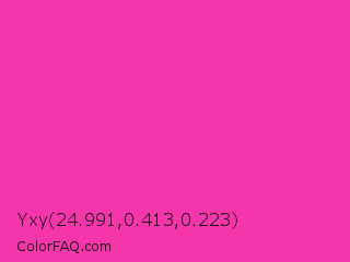 Yxy 24.991,0.413,0.223 Color is a normal magenta color and the nearest color is Frostbite #e936a7. Hex code #f536ab and RGB value is rgb(245,54,171). In RGB color space, this color is composed of 96% red, 21% green, 67% blue, In CMYK color space, this color is composed of 0% cyan, 78% magenta, 30% yellow , 4% black , In HSL color space, this color has a hue angle of 323° , 91% saturation and 59% lightness.