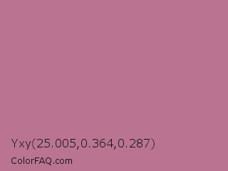 Yxy 25.005,0.364,0.287 Color is a normal rose color and the nearest color is English Lavender #b48395. Hex code #ba7492 and RGB value is rgb(186,116,146). In RGB color space, this color is composed of 73% red, 45% green, 57% blue, In CMYK color space, this color is composed of 0% cyan, 38% magenta, 22% yellow , 27% black , In HSL color space, this color has a hue angle of 334° , 34% saturation and 59% lightness.