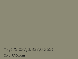 Yxy 25.037,0.337,0.365 Color is a normal yellow color and the nearest color is Granite Green #8d8974. Hex code #8c8a75 and RGB value is rgb(140,138,117). In RGB color space, this color is composed of 55% red, 54% green, 46% blue, In CMYK color space, this color is composed of 0% cyan, 1% magenta, 16% yellow , 45% black , In HSL color space, this color has a hue angle of 55° , 9% saturation and 50% lightness.