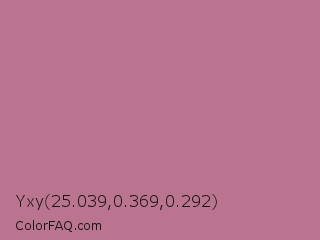 Yxy 25.039,0.369,0.292 Color is a normal rose color and the nearest color is Turkish Rose #b57281. Hex code #bb748f and RGB value is rgb(187,116,143). In RGB color space, this color is composed of 73% red, 45% green, 56% blue, In CMYK color space, this color is composed of 0% cyan, 38% magenta, 24% yellow , 27% black , In HSL color space, this color has a hue angle of 337° , 34% saturation and 59% lightness.
