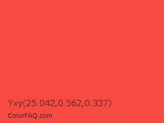 Yxy 25.042,0.562,0.337 Color is a light red color and the nearest color is Sunset Orange #fe4c40. Hex code #f74a40 and RGB value is rgb(247,74,64). In RGB color space, this color is composed of 97% red, 29% green, 25% blue, In CMYK color space, this color is composed of 0% cyan, 70% magenta, 74% yellow , 3% black , In HSL color space, this color has a hue angle of 3° , 92% saturation and 61% lightness.