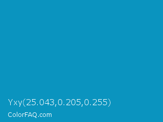 Yxy 25.043,0.205,0.255 Color is a normal blue color and the nearest color is Blue Green #0d98ba. Hex code #0a94bf and RGB value is rgb(10,148,191). In RGB color space, this color is composed of 4% red, 58% green, 75% blue, In CMYK color space, this color is composed of 95% cyan, 23% magenta, 0% yellow , 25% black , In HSL color space, this color has a hue angle of 194° , 90% saturation and 39% lightness.