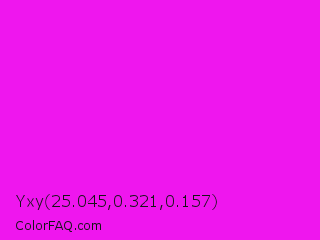 Yxy 25.045,0.321,0.157 Color is a normal magenta color and the nearest color is Phlox #df00ff. Hex code #ef16ee and RGB value is rgb(239,22,238). In RGB color space, this color is composed of 94% red, 9% green, 93% blue, In CMYK color space, this color is composed of 0% cyan, 91% magenta, 0% yellow , 6% black , In HSL color space, this color has a hue angle of 300° , 87% saturation and 51% lightness.