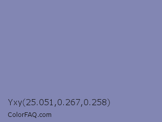 Yxy 25.051,0.267,0.258 Color is a light blue color and the nearest color is Wild Blue Yonder #7a89b8. Hex code #8286b3 and RGB value is rgb(130,134,179). In RGB color space, this color is composed of 51% red, 53% green, 70% blue, In CMYK color space, this color is composed of 27% cyan, 25% magenta, 0% yellow , 30% black , In HSL color space, this color has a hue angle of 235° , 24% saturation and 61% lightness.